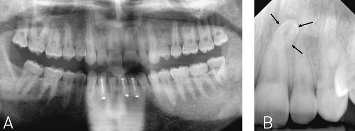 Fig. 6 A: Beskåret panoramabillede, hvor det er svært med sikkerhed at diagnosticere «mesiodens» regio +1. B: Intraoral, periapikal optagelse regio +1 (samme patient som vist i Fig. 6A) viser tydeligt tilstedeværelse af «mesiodens» (pile).