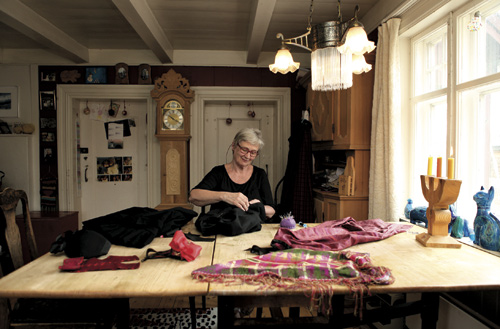 Bjørg Figenschou syr på stuebordet i sitt hjem på Røros i Sør-Trøndelag.