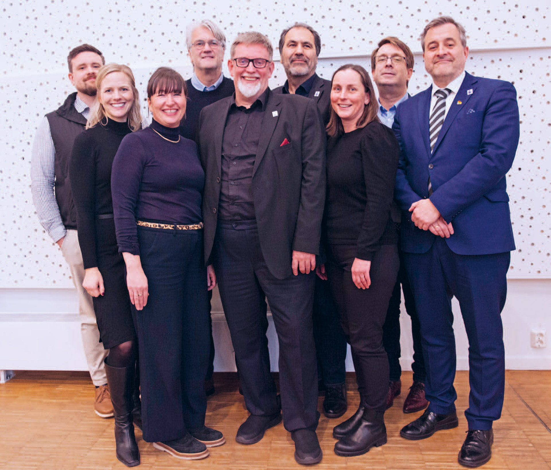 NTFs hovedstyre for perioden 2026-2027, fra venstre: Erland Furuseth Jensen, Ragnhild Henriksen Løken, Linn Katariina Henriksen, Jon Arne Gangvik-Østgaard, Heming Olsen-Bergem, Farshad Alamdari, Lene Aarvik, Kristoffer Øvstetun og Terje Fredriksen.