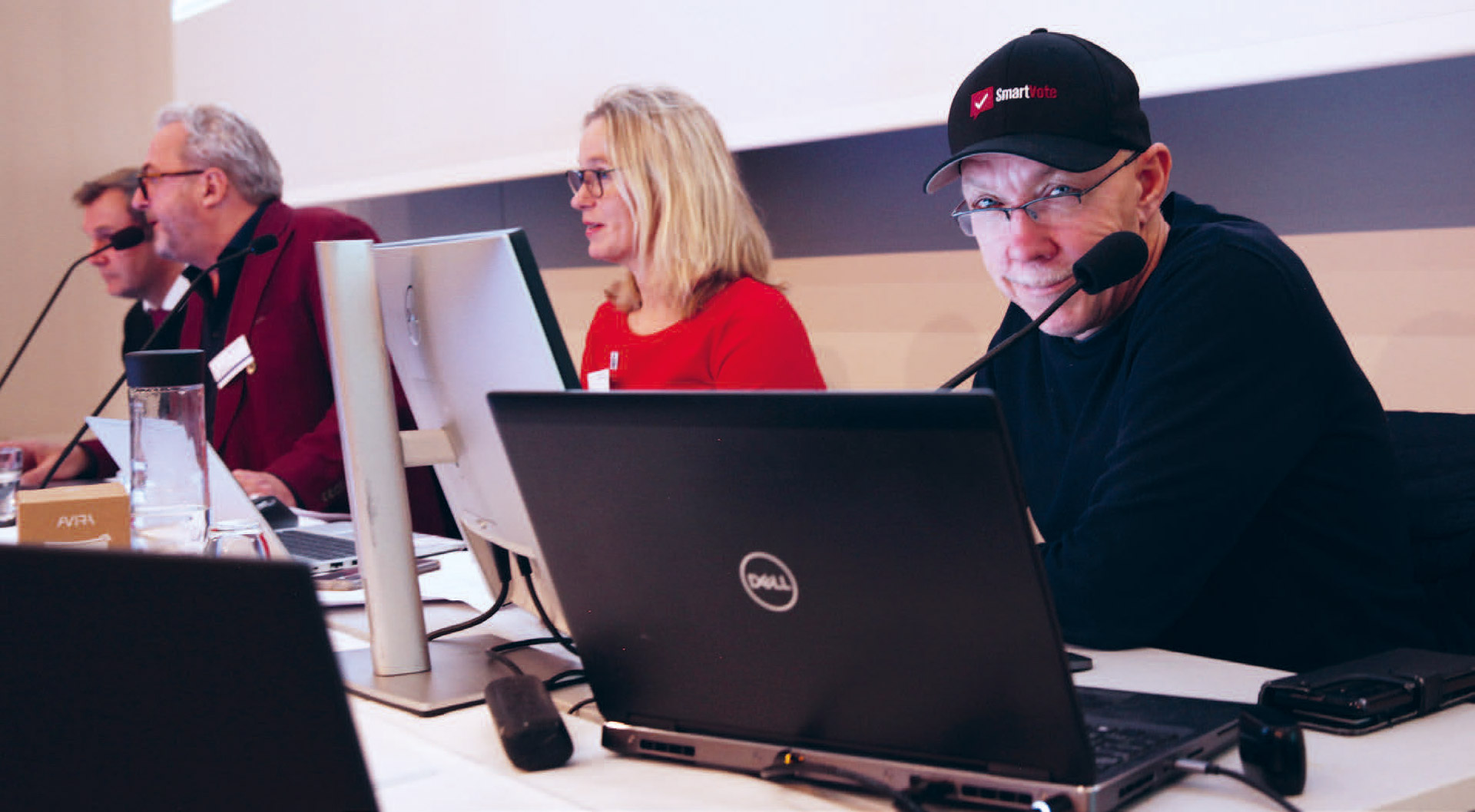Et representantskapsmøte med 74 stemmeberettigede og nesten like mange taletrengte trenger god ledelse, formelt og teknisk. Her ved ordførerkollegiet til venstre for daglig leder Sveinung Flaathen i SmartDialog, som sto for det tekniske (helt til høyre).