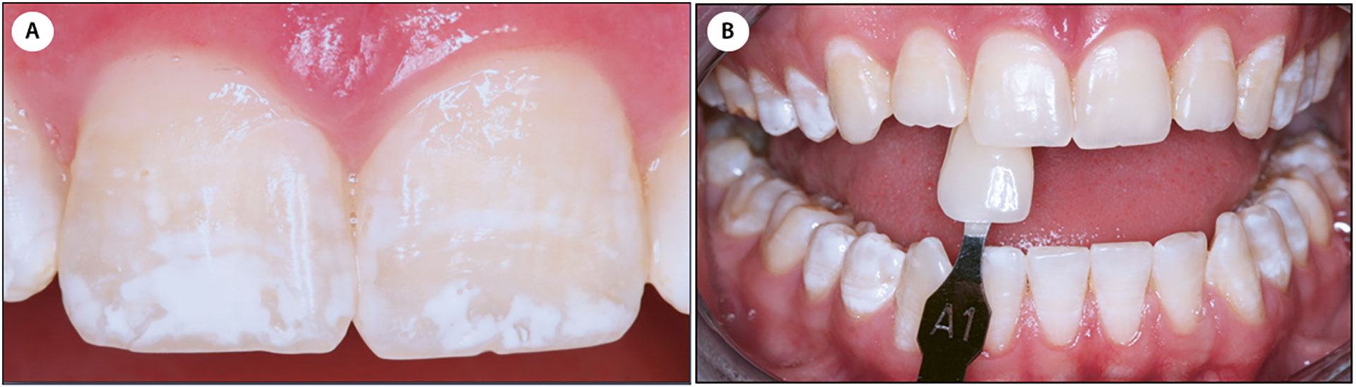 Pasienten var en 21 år gammel kvinne som var svært misfornøyd med utseendet på tennene i overkjevens front (tann 11 og 21), og ønsket å få disse behandlet. Tennene hadde alltid hatt dette spesielle utseendet. Den kliniske undersøkelsen viste at tann 11 og 21 hadde diffuse, hvite opasiteter (figur 7a). Ingen andre tenner hadde synlige emaljeforstyrrelser. Ut fra det kliniske bildet med avgrensede hvite og gule opasiteter på sentralene, samt bakgrunnshistorien, var det nærliggende å tro at diagnosen var «hypomineralisering tann 11 og 21 pga. traume mot 51 og 61».