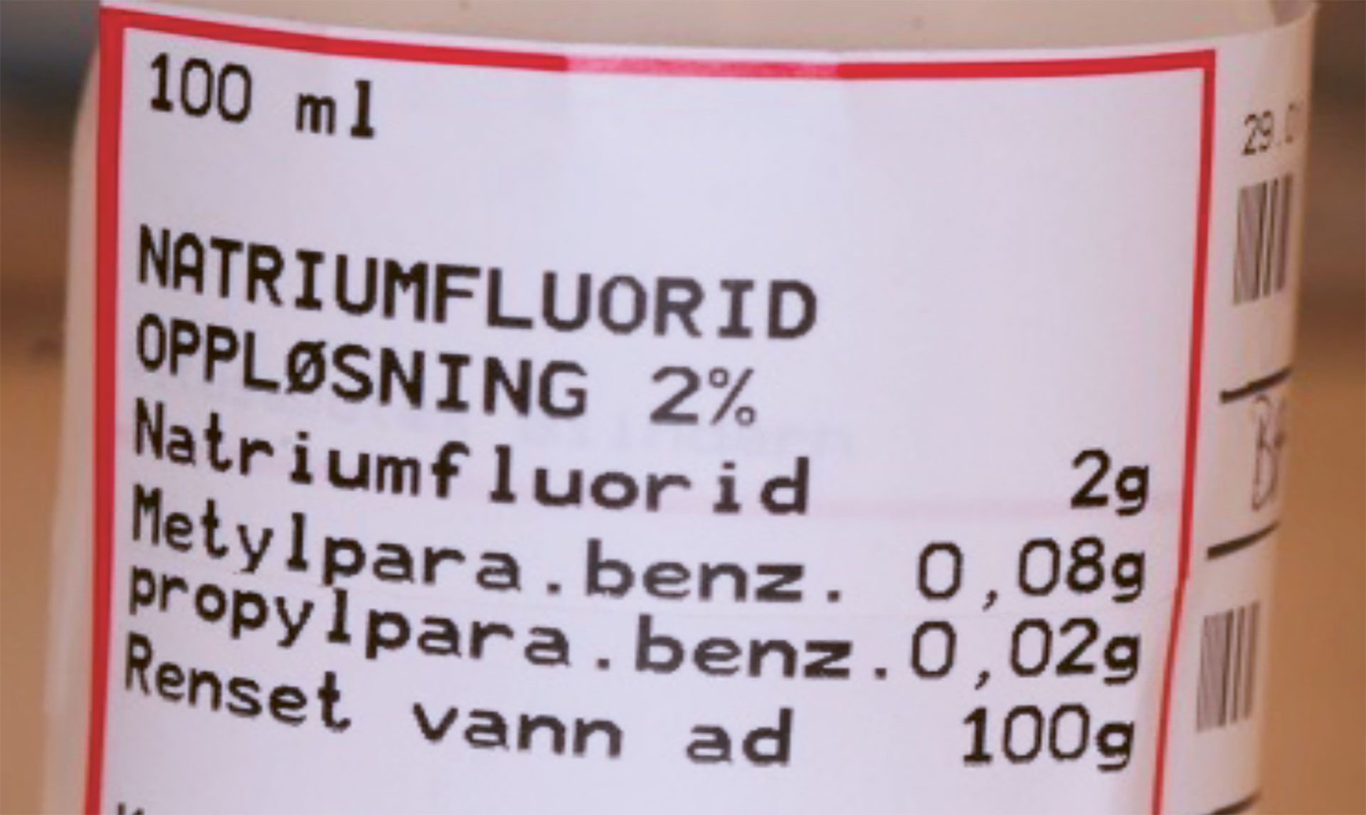 Figur 4. Eksempel på ferdiglaget 2 % natriumfluorid (NaF)-løsning (100 ml [2g NaF [mw 42] og 100 ml destillert H2O]) fra apoteket.