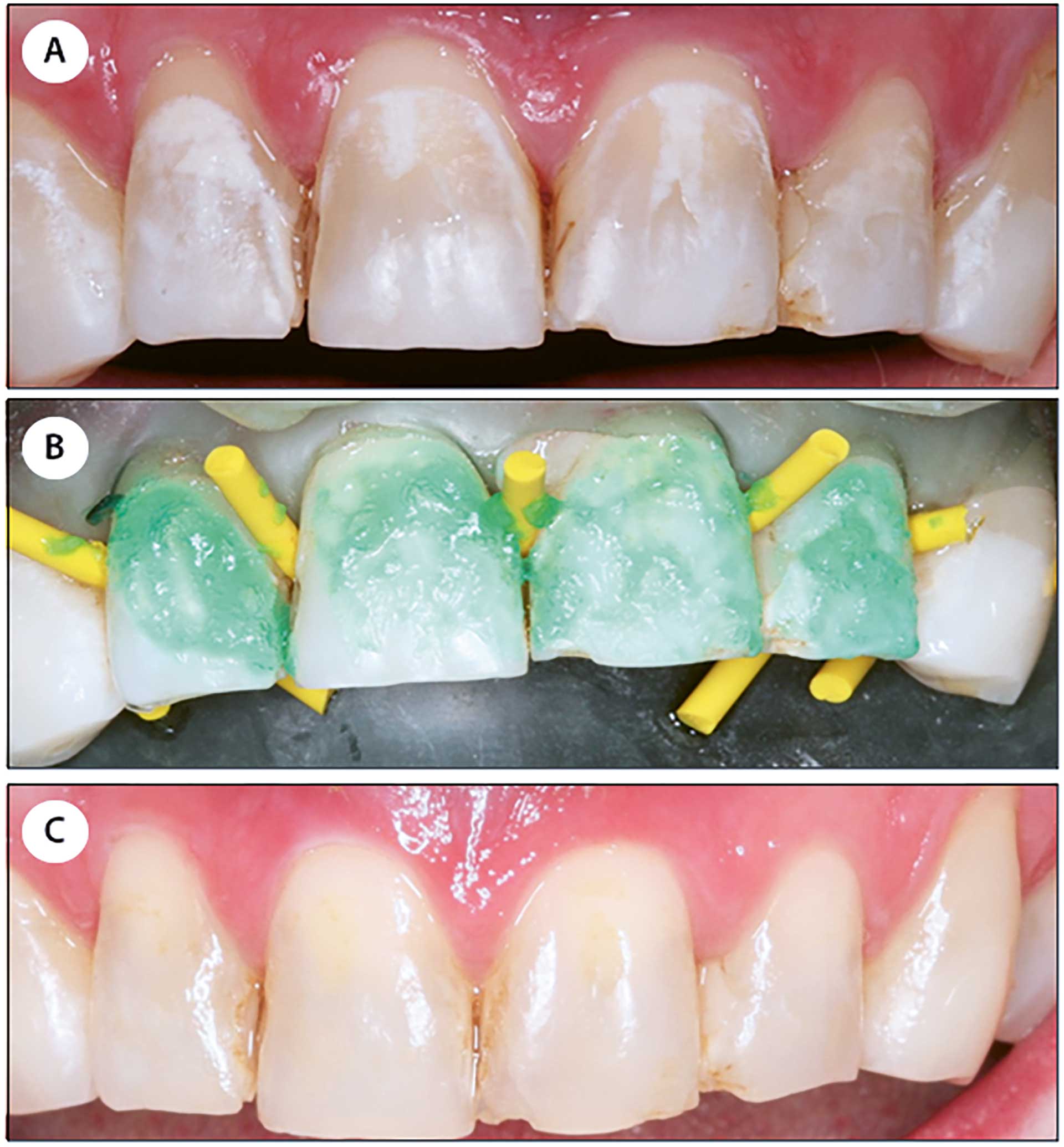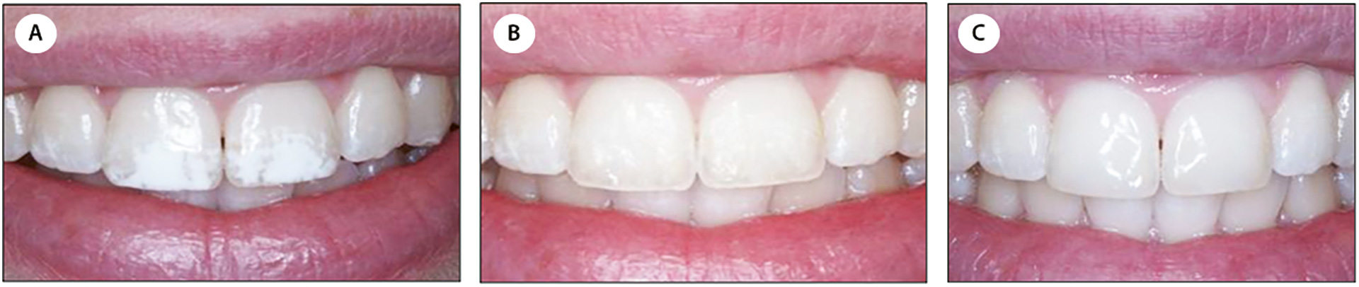 Kasus 3 var en mann på 35 år som oppsøkte tannlegen fordi han var svært misfornøyd med misfargingene i overkjevens front forårsaket av kjeveortopedisk behandling. Pasienten syntes det var sjenerende med den dårlige estetikken til de kritthvite områdene (figur 5a). De hvite områdene var trolig stanset karies (krittkaries), som mest sannsynlig hadde oppstått i forbindelse med kjeveortopedisk behandling og utilstrekkelig munnhygiene. Målet med behandlingen var å forbedre utseendet på tennene i overkjevens front, og det ble besluttet å behandle tennene med mikroabrasjon. Etter gjennomført mikroabrasjonsbehandling virket tennene skjoldete og porøse, og de tiltrakk seg lett ekstern misfarging. Det ble derfor besluttet å «infiltrere» flatene med ICON®-DMG (figur 5b). Kofferdam ble påsatt for å beskytte mukosa mot skader fra syren «Icon®-Etch» (15 % HCl), som ble påført. De porøse tannflatene ble deretter skylt med vann i 30 sekunder og blåst tørre. Så ble «Icon®-Dry» (99 % etanol) påført for å teste om etsingen hadde vært effektiv. Etseprosedyren ble gjentatt opptil tre ganger (á to minutter). Deretter ble «Icon®-Infiltrant» påført (trietylenglykol dimetakrylat basert resin og initiator) i tre minutter før lysherding i minimum 40 sekunder. Ifølge produsenten bør herdelampen ha en lysintensitet på 450 nm og en styrke på 800 mW/cm2. Et nytt resinlag ble påført i ett minutt og lysherdet i nye 40 sekunder. Tannflatene ble så polert med gummipolerer. Resultatet ble tilfredsstillende, og pasienten var svært fornøyd (figur 5c).
