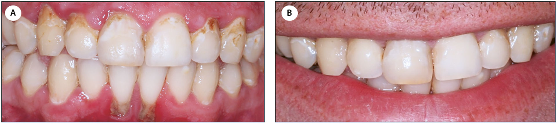 Kasus 4 var en 24 år gammel mann som var plaget av misfarginger i overkjevens front og ønsket å få behandlet disse. Intraoralt var tannsettet preget av svært mangelfullt renhold, mye supra- og subgingival tannstein, samt kritthvite og gulbrune misfarginger i den øvre cervikale 1 /3 av de bukkale flatene på tennene i regio 14-24 (figur 6a). Pasienten var svært opptatt av den dårlige estetikken på fronttennene i overkjeven. Det var helt nødvendig å starte med motivasjon for å bedre munnhygienen (hygienefase), kostholdsinformasjon og implementering av fluoridtilskudd før videre behandling, der målet var å bedre estetikken. Samtidig skulle en vevsbesparende behandling ivaretas. Misfargingen (kritthvit til gulbrun), som sannsynligvis var aktiv og kronisk emaljekaries, ble behandlet med ICON®-DMG for å forsegle tannflatene og gi et best mulig estetisk resultat. Oppfølgingen etter 3,5 år viste gode og varige resultater (figur 6b).