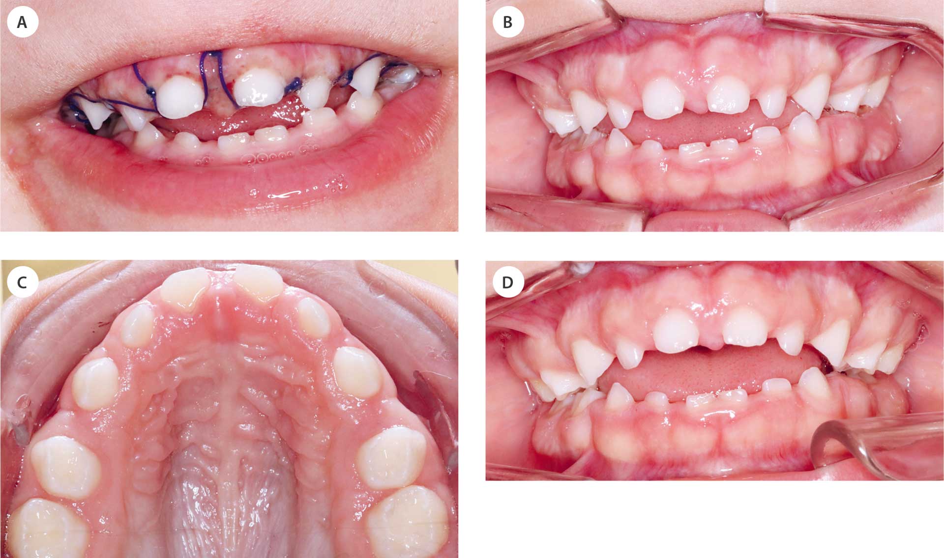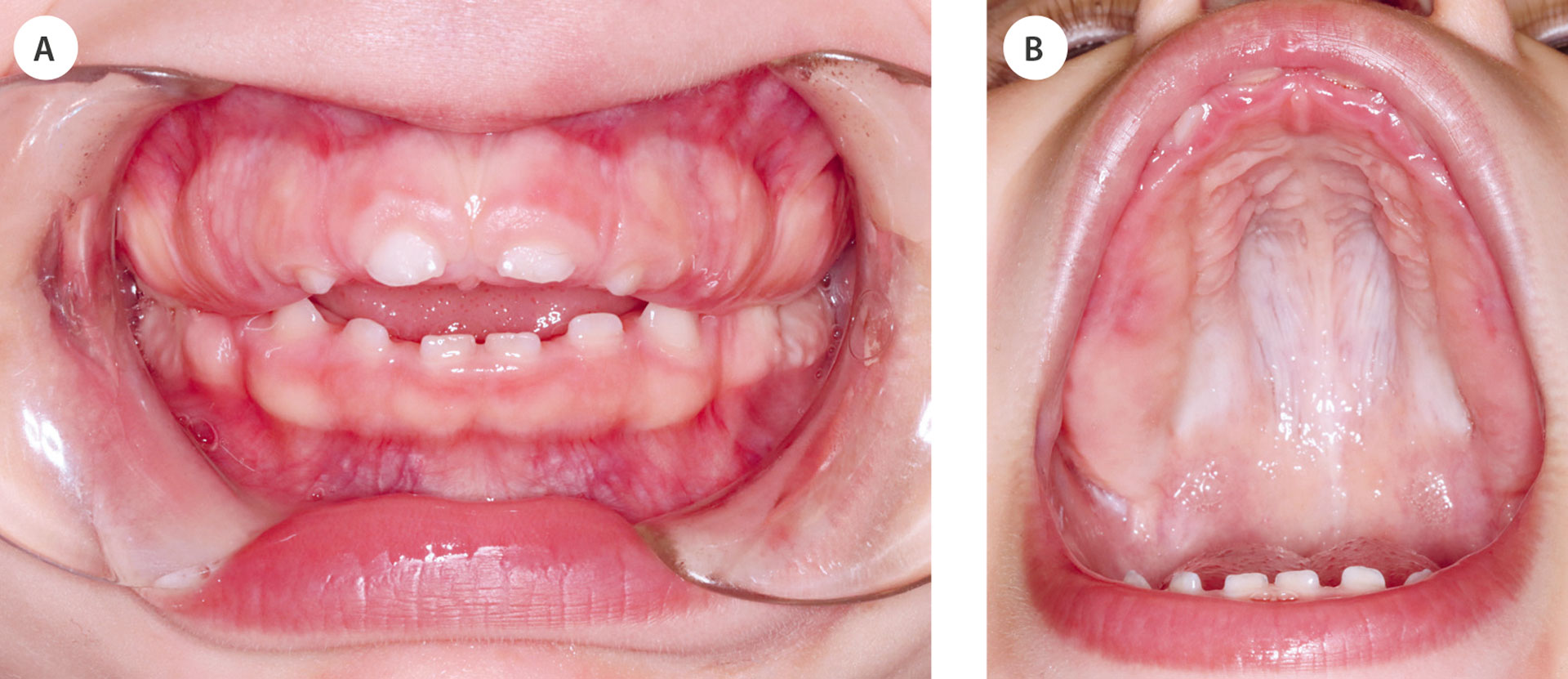 Klinisk ble det observert åpen munnstilling og manglende leppelukking, samt salivalekkasje. Tann 52, 51, 61 og 62 var delvis dekket av gingiva. Fibrøs, atypisk gingiva dekket alveolarkammen i sidesegmentene. Tennene 55, 54, 53, 63, 64 og 65 var ikke synlige og kunne heller ikke palperes (figur 1a–b).