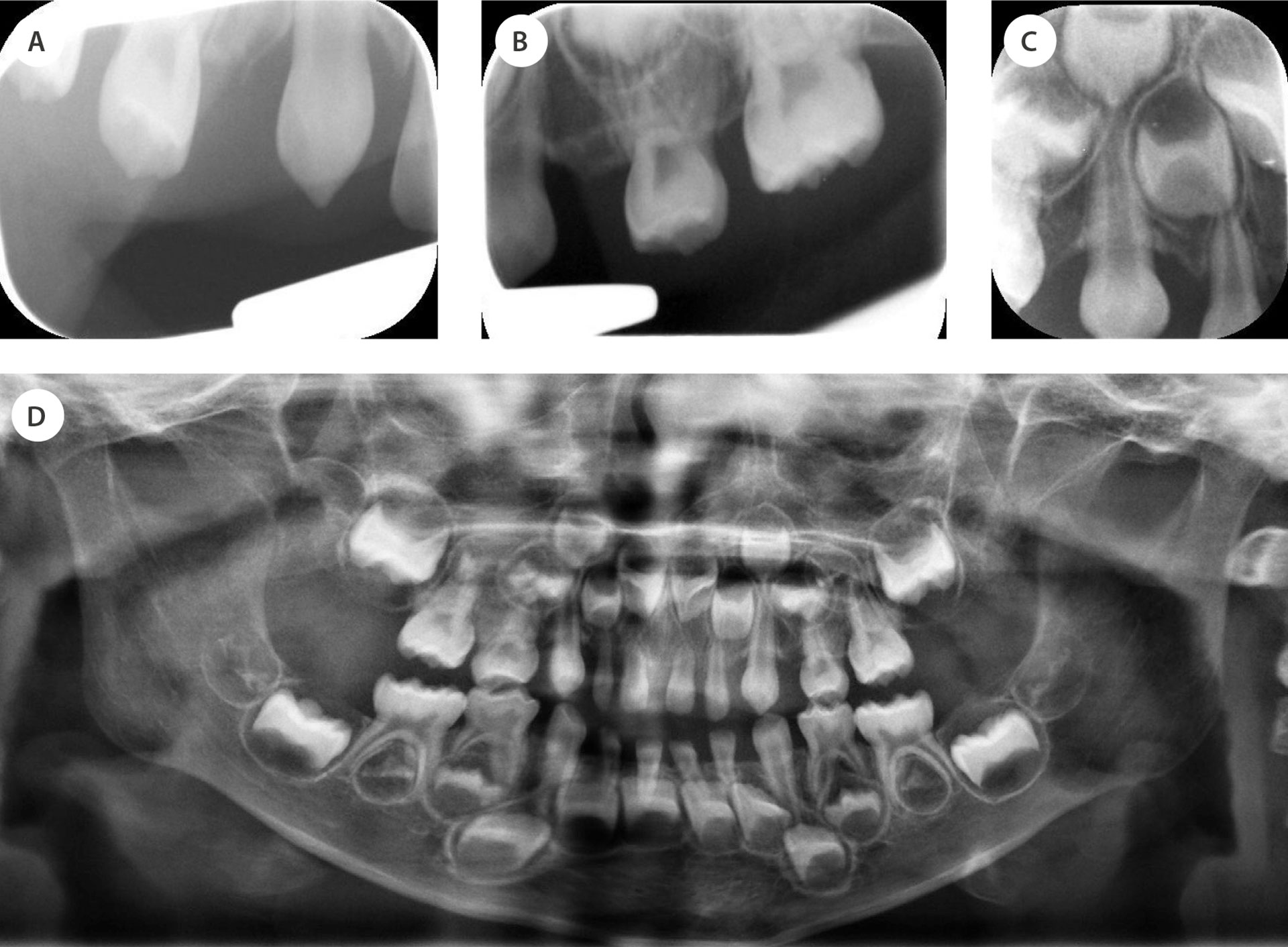 Periapikale røntgenbilder av sidesegmentene viste at tennene 55, 54, 53, 63, 64 og 65 var brutt gjennom ben med hele tannkronen (figur 2a–c). Pasienten hadde også et høyt festet labialt frenulum med vifteform, noe som gjorde overleppen stram og trakk den inn. I underkjeven var tennene 73, 72, 71, 81, 82 og 83 delvis dekket av gingiva. For tann 74 og 84 kunne man delvis se okklusalflaten, men glattflatene var ikke synlige. Selv om gingiva i underkjeven også var fibrøs og atypisk, var bildet ikke like uttalt som i overkjeven. Tannutviklingen på røntgen var forenlig med 4,5-årsalder og var dermed kommet lenger enn gjennomsnittet for pasientens alder [1].