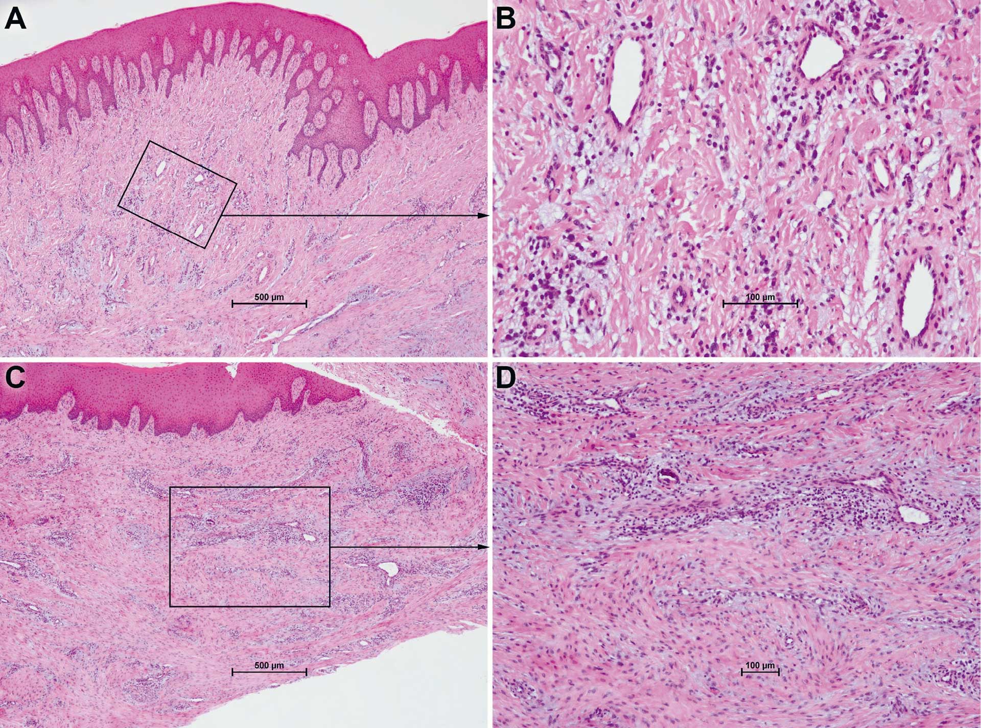 C og D. Gingivalslimhinne med fibrøs hyperplasi og lyse basofile/myxoide områder samt mild fokal infiltrasjon av kroniske betennelsesceller.